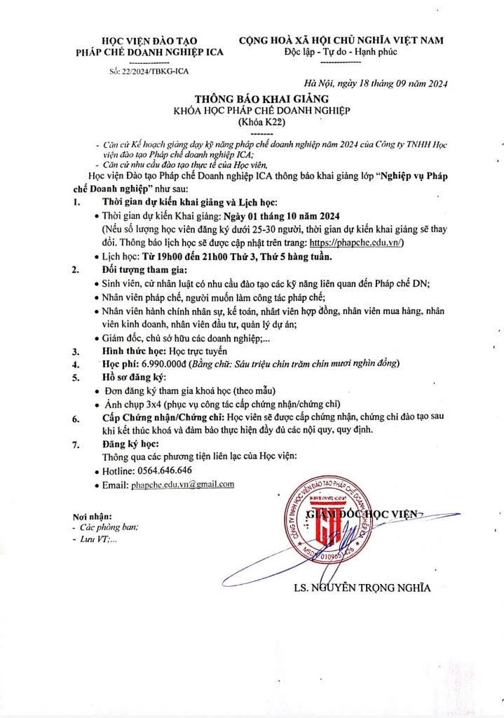 Học viện Đào tạo Pháp chế Doanh nghiệp ICA thông báo khai giảng lớp “Nghiệp vụ Pháp chế Doanh nghiệp” Khóa K22 như sau:
